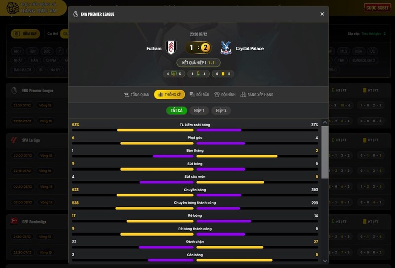 - Thống kê kiểm soát bóng, số cú sút – Đều đủ cả